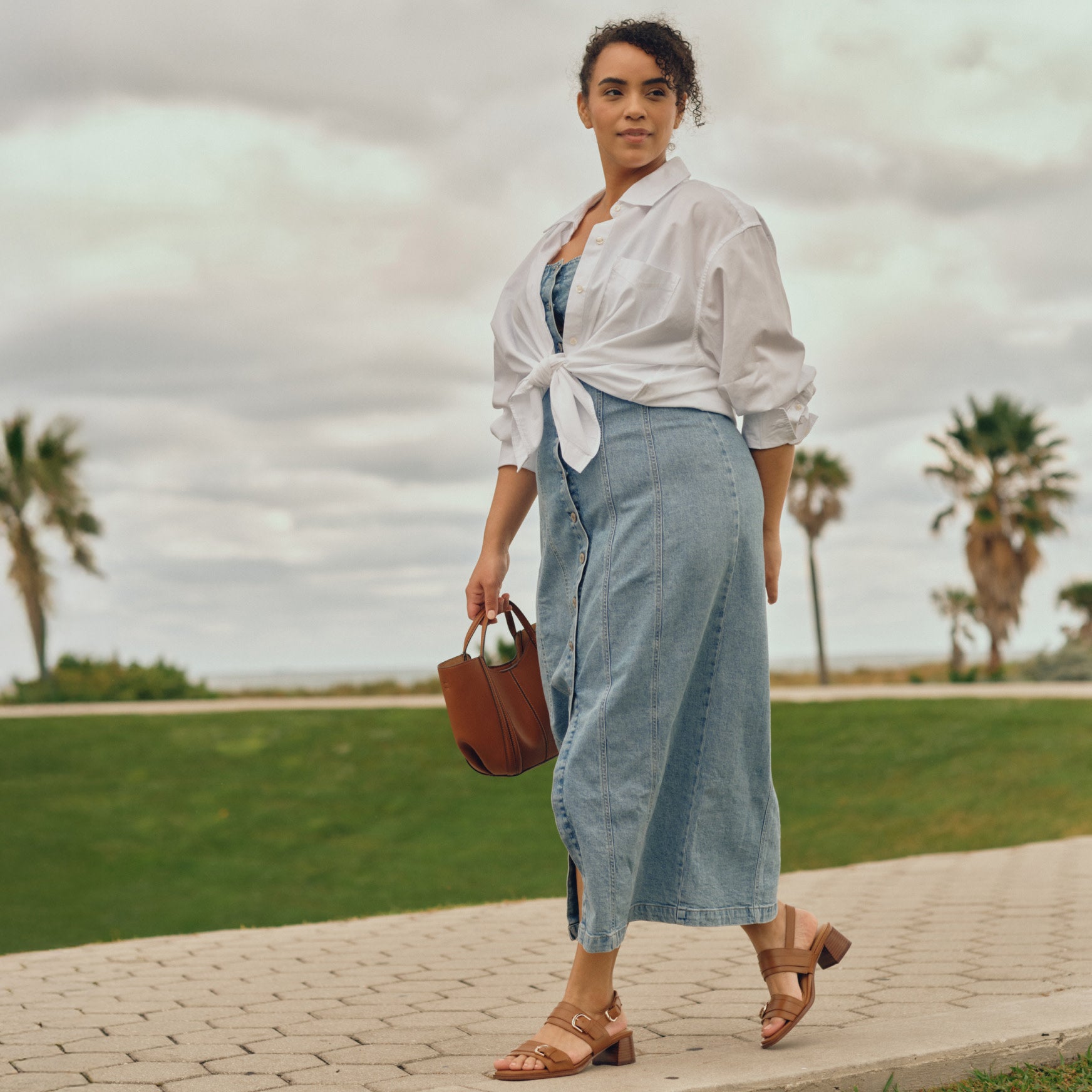 A tailored dress sandal built with eFlex Technology, the Hadiya pairs polished design with walkable, all-day comfort. Two wide straps sit across the foot, each finished with oversized gold-tone buckle hardware that catches the light without overdoing it. The open square toe keeps the silhouette modern, while a stacked wood-look block heel offers just enough lift to feel refined from the office to dinner. Available in smooth leather and a warm woven fabric, every version shares the same clean topstitching and slingback closure for easy adjustability. Inside, a cushioned footbed with built-in arch support cradles your step, and flex grooves in the sole let it move naturally with your stride. The low, grounded heel keeps you steady all day long. Available in medium and wide widths.