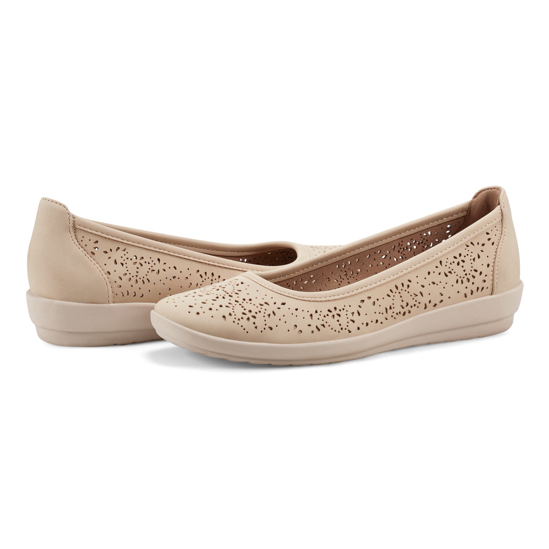 A classic ballet flat gets an upgrade with thoughtful comfort details woven right in. The Alessia is designed as a slip-on style with a sleek, streamlined silhouette and decorative perforations that create a delicate floral pattern across the upper. A slight wedge heel adds just enough lift without sacrificing stability, while the rounded toe gives your foot plenty of room to move naturally. Underfoot, plush cushioning absorbs the impact of busy days, and a lightweight midsole keeps the feel responsive without weighing you down. The rubber outsole delivers reliable traction, so you stay sure-footed from morning errands to evening plans.